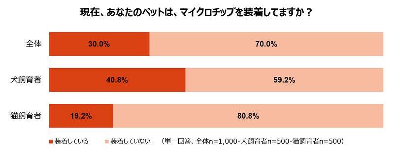 最後に「あなたのペットは、マイクロチップを装着していますか」と尋ねたところ、全体の3割が「装着している」と回答しました。犬・猫を比べると装着率に20ポイントの差異があり、犬の装着率は40.8%、猫の装着率は19.2%となりました。