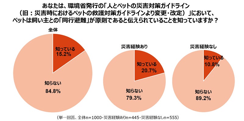 環境省は災害が発生した際に、飼育者とペットが「同行避難」することを推奨しています。これを知っているか尋ねたところ、「知っている」と答えた方は全体の約15%に留まりました。