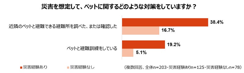 災害経験の有無によって大きな差が出たのは「ペットが逃げ出さないようにドアや窓などを確認した」および「ペットの動線上から危険なものを極力排除した」で、災害経験者は約4割が実施したものの、未経験者の実施率は約2割に留まりました。災害を経験することで、災害時のリスクや課題をより具体的に認識することができ、その結果、対策の実施率が高まっているのかもしれません。