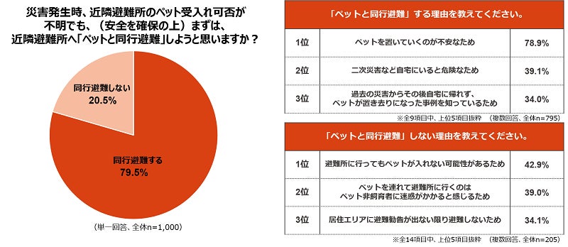 ただ、「同行避難」が推奨されていることを知らない場合でも、災害発生時にペットと同行避難しようと考える方は約8割に上り、多くの方がペットとの避難を望んでいるようです。