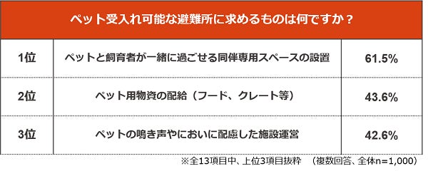 ・避難所に望むのは「ペットと一緒に過ごせる」約61%、「同行避難≠一緒に過ごせる」に留意