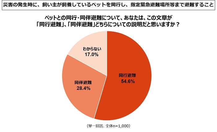 ただ、実際には「ペット受入れ避難所」であっても、ペットと飼育者の方が同じ環境で過ごせるとは限りません。「同行避難」とはあくまでも「安全な場所までペットと一緒に避難する行動」を指す言葉であり、ペットと過ごせるかどうかは分かりません。以下は「同行避難」について説明した文章ですが、文章の意味を正確に捉えている方は約半数に留まっています。