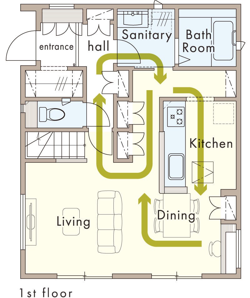 水廻りとキッチン中心の2つの回遊が合わさった、「水廻り集中・キッチン中心回遊プラン」は、帰宅後すぐに洗面所で手洗いができウイルス対策にもなります。キッチン廻りの収納が多く、出し入れもしやすい動線で、家族のくつろぎの場所と時間を確保します。