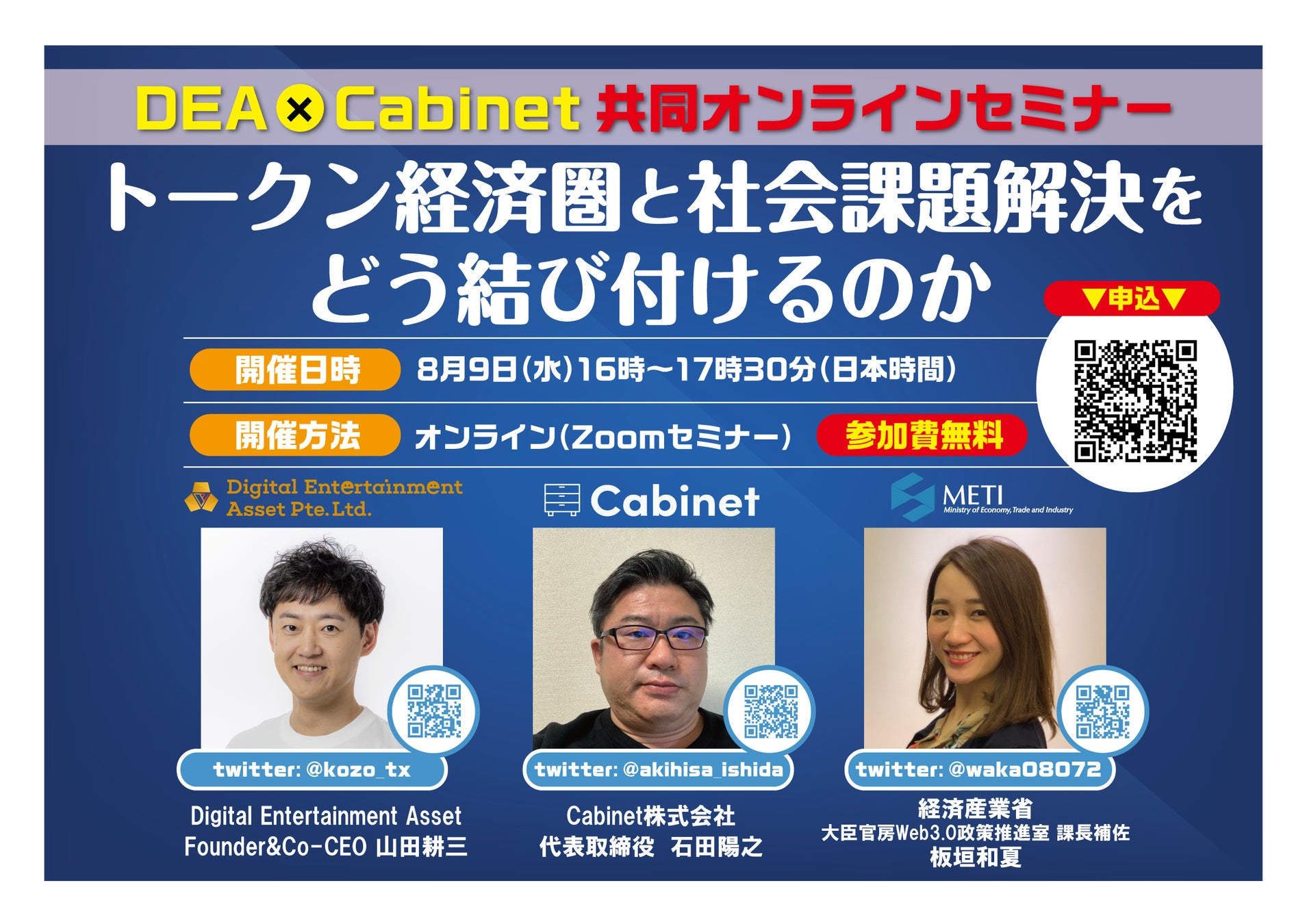 また業務提携の第1弾として、8月9日(水)に経済産業省Web3.0政策推進室の板垣和夏 氏をお招きし、「トークン経済圏と社会課題の解決をどう結び付けるか」と題してオンラインセミナーをDEAとCabinetで共同開催いたします。