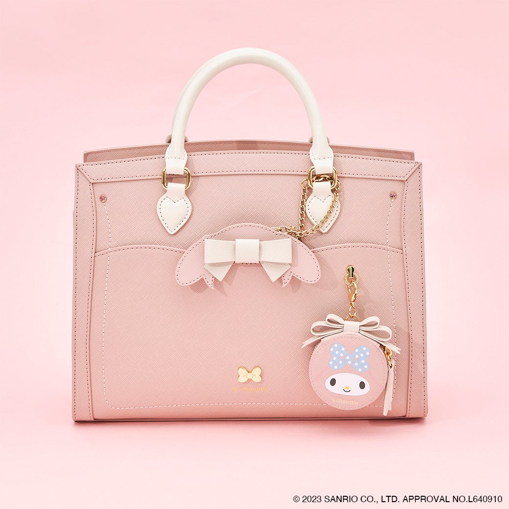 マイメロディのイメージカラー・ピンクとホワイトでデザインされたハンドバッグ。