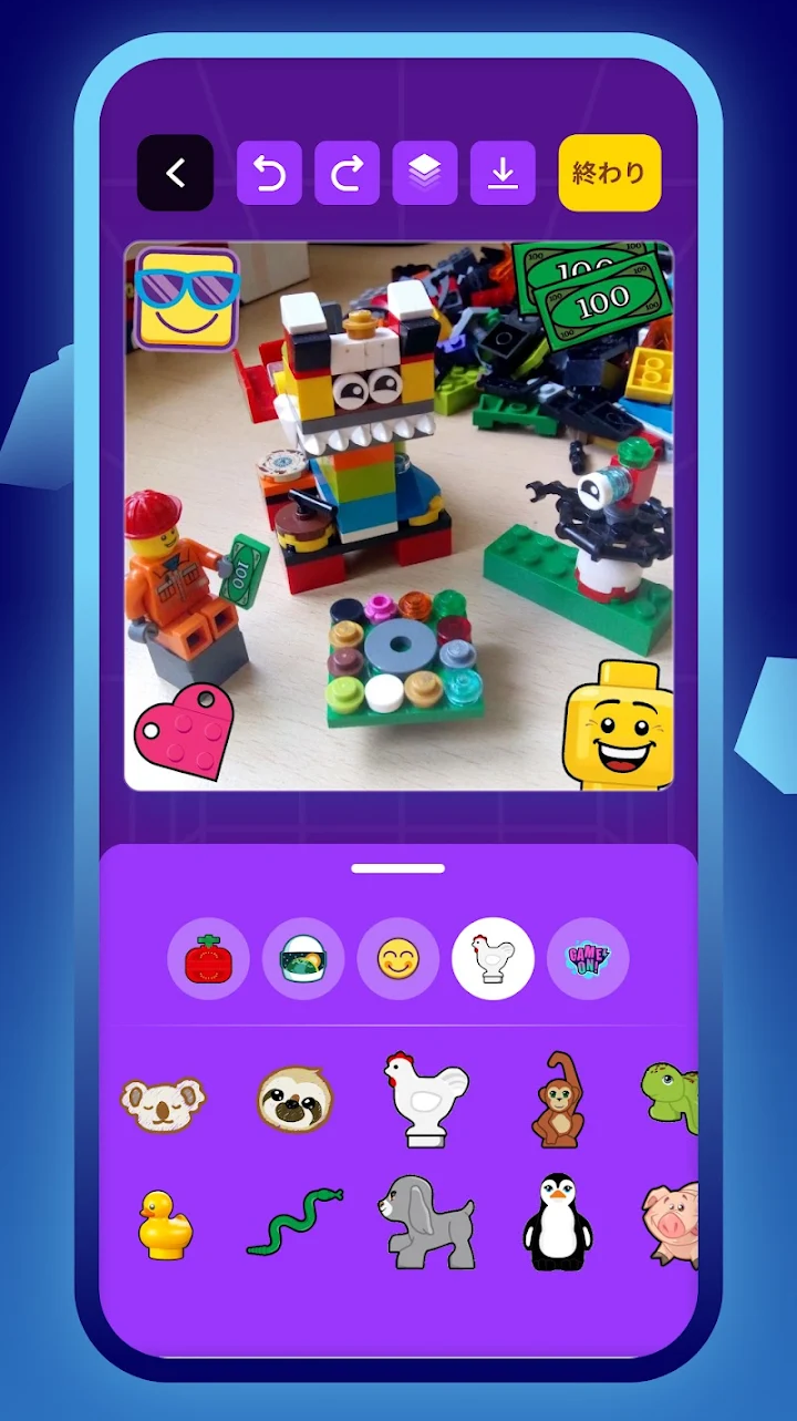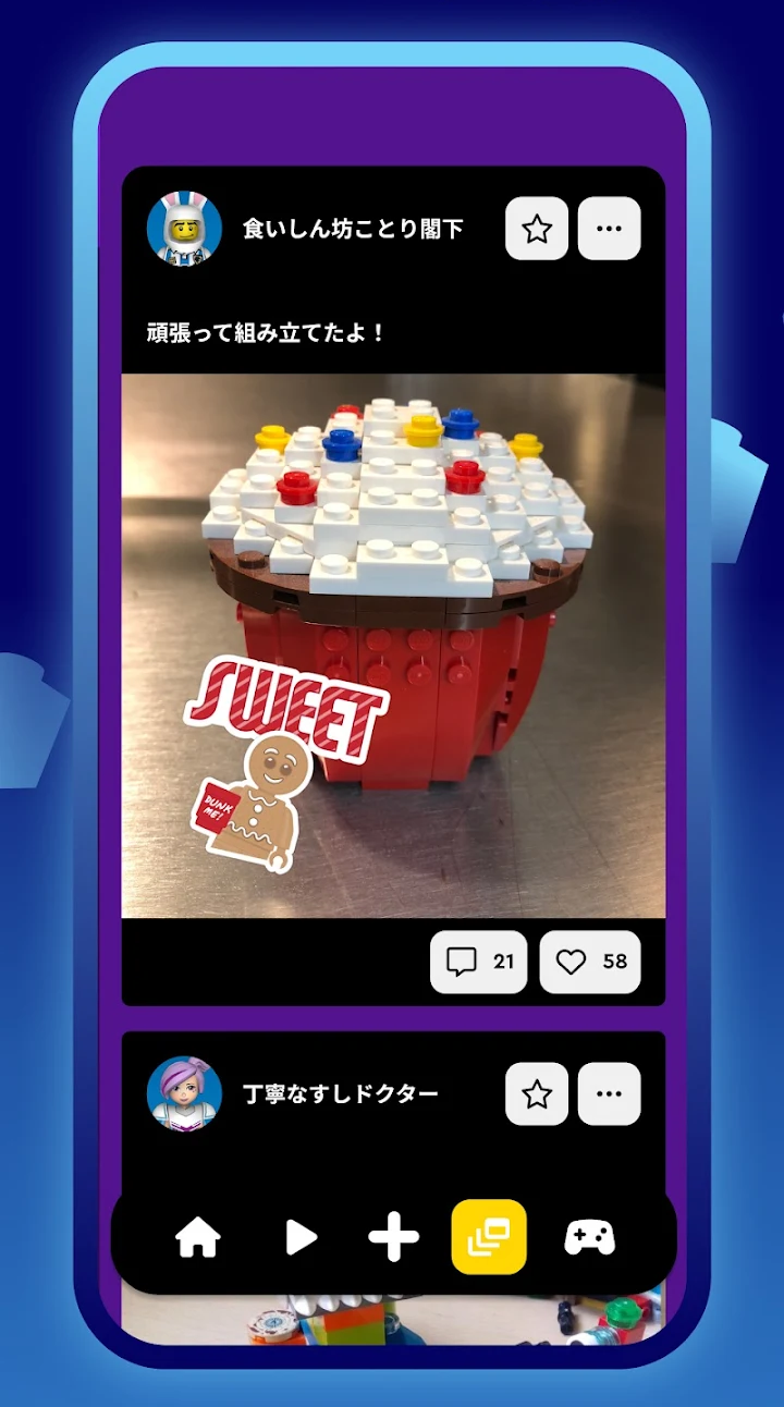 自分の作ったレゴ®ブロック作品の写真やアプリ上で作ったデジタル作品を共有することができ、さらにスタンプやフレームなどを使用して写真を加工したり、作品のタイトルや説明、#タグなどをつけて投稿を楽しむことができます。