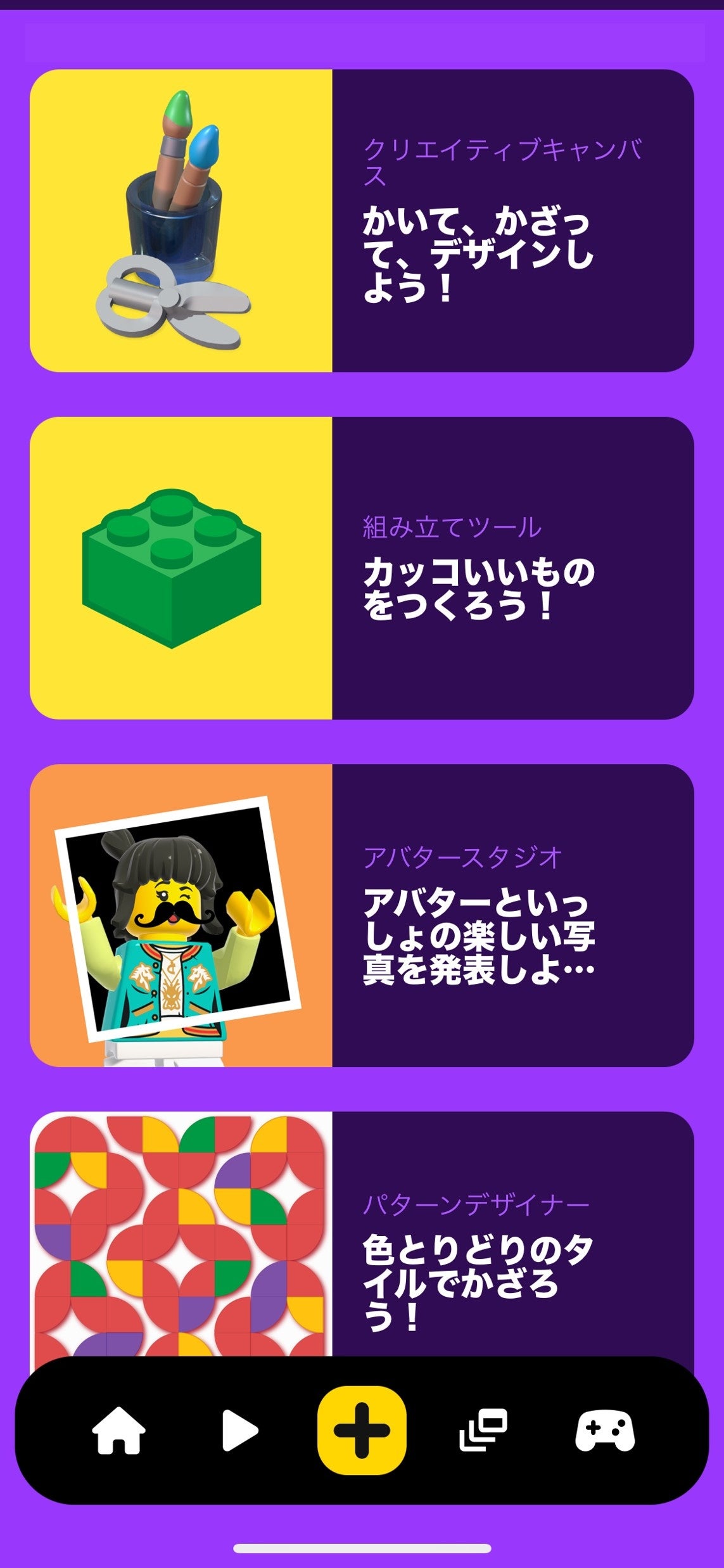 書いて飾ってデザインすることが可能な「クリエイティブキャンパス」や3Dブロックを使って組み立て体験が出来る「組み立てツール」、基礎板プレートにカラフルなパーツを飾ってモザイク作品を作れる「パターンデザイナー」など、レゴ®ブロックが手元になくてもアプリ内に搭載されているクリエイターツール機能を使ってデジタル作品の作成が可能です。