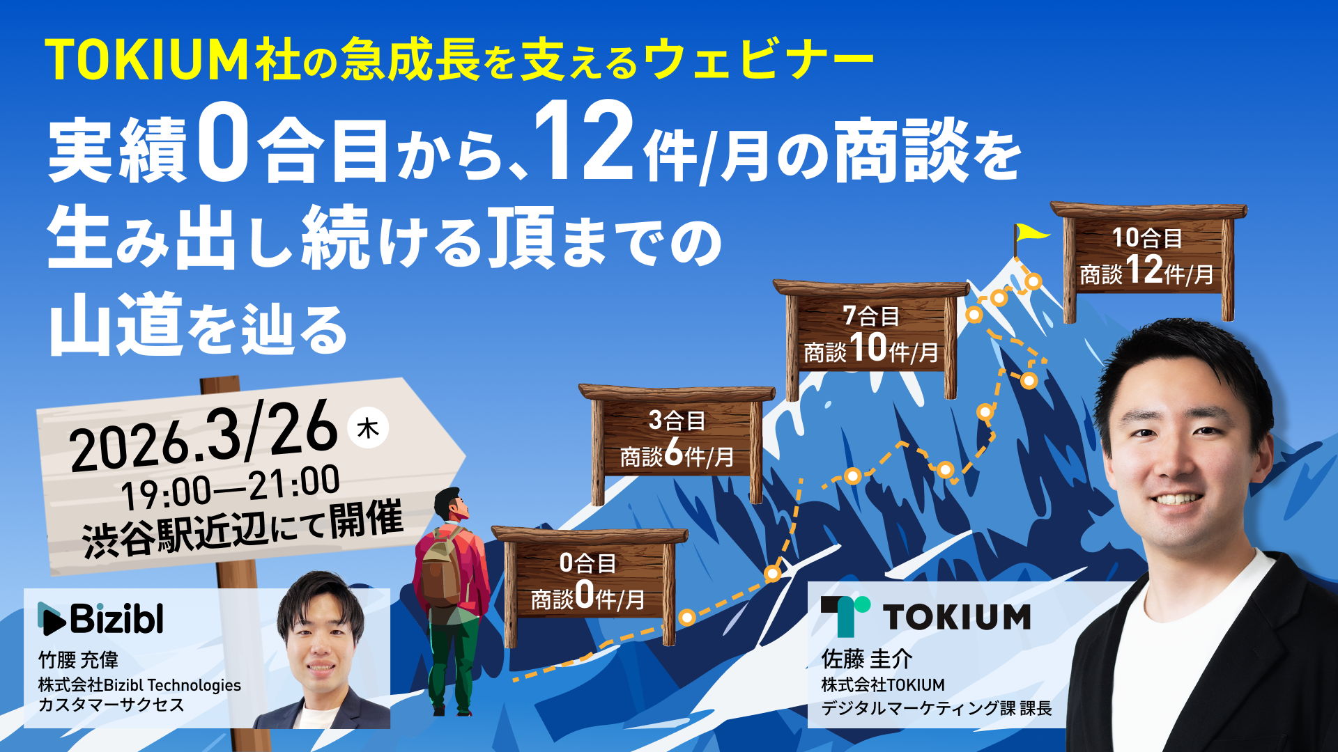 ウェビナーマーケティングツール「Bizibl(ビジブル)」を提供する株式会社Bizibl Technologies(本社:東京都千代田区、代表取締役:花谷 燿平、以下 Bizibl)は、商談創出をKGIに据えたウェビナー運用の意思決定プロセスをテーマとしたオフラインイベント「TOKIUM社の急成長を支えるウェビナー 実績 0 合目から、12件/月商談を生み出し続ける頂までの山道を辿る」を、2026年3月26日(木)にTIME SHARING 渋谷ワールド宇田川ビル 9Aにて開催いたします。