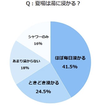 対してほぼ毎日浸かる・時々浸かるが66%で、特に毎日浸かるという人は4割以上という結果になりました。みなさん、暑い夏の時期でも積極的に湯舟に浸かっているようで、日本人がいかにお風呂好きかが伺えます。