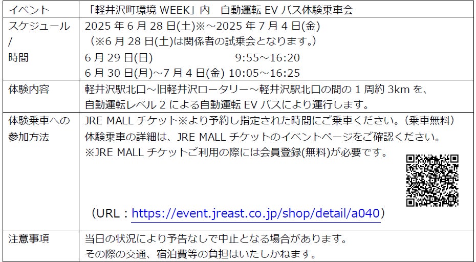 A-Drive株式会社(本社:神奈川県横浜市、代表取締役社長:岡部 定勝)および、アイサンテクノロジー株式会社(本社:愛知県名古屋市、代表取締役社長:加藤 淳)は、2025年6月28日(土)~7月4日(金)の期間において、軽井沢駅と観光地として人気の旧軽井沢エリアを結ぶルートで自動運転(レベル2)の体験乗車会に参画いたします。