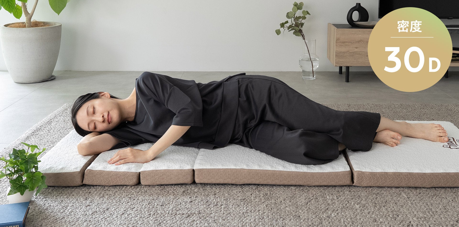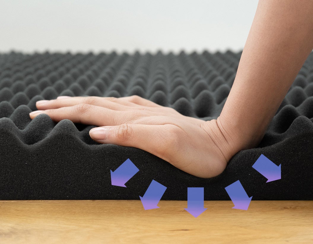 ごろ寝マットとはいえ、身体を預けて支える人体系家具。素材や工法はマットレスと同様に設計しました。中材には通気性と体圧分散性に優れた、プロファイル加工の高反発ウレタンを使用。適度な弾力で体を支え、厚み6cmでも快適な寝心地を実現しました。また、十分な耐久性保持のため、ウレタン密度は30Dクラスを採用しました。