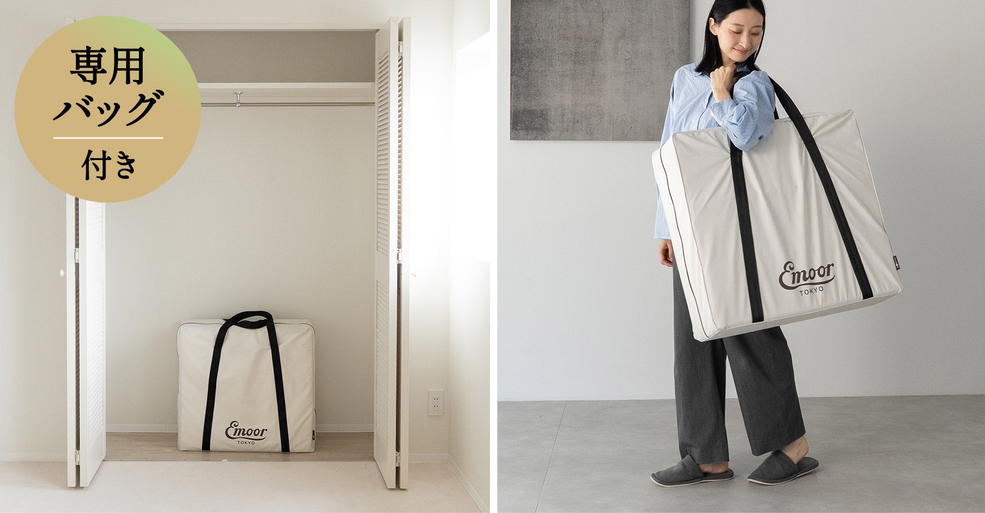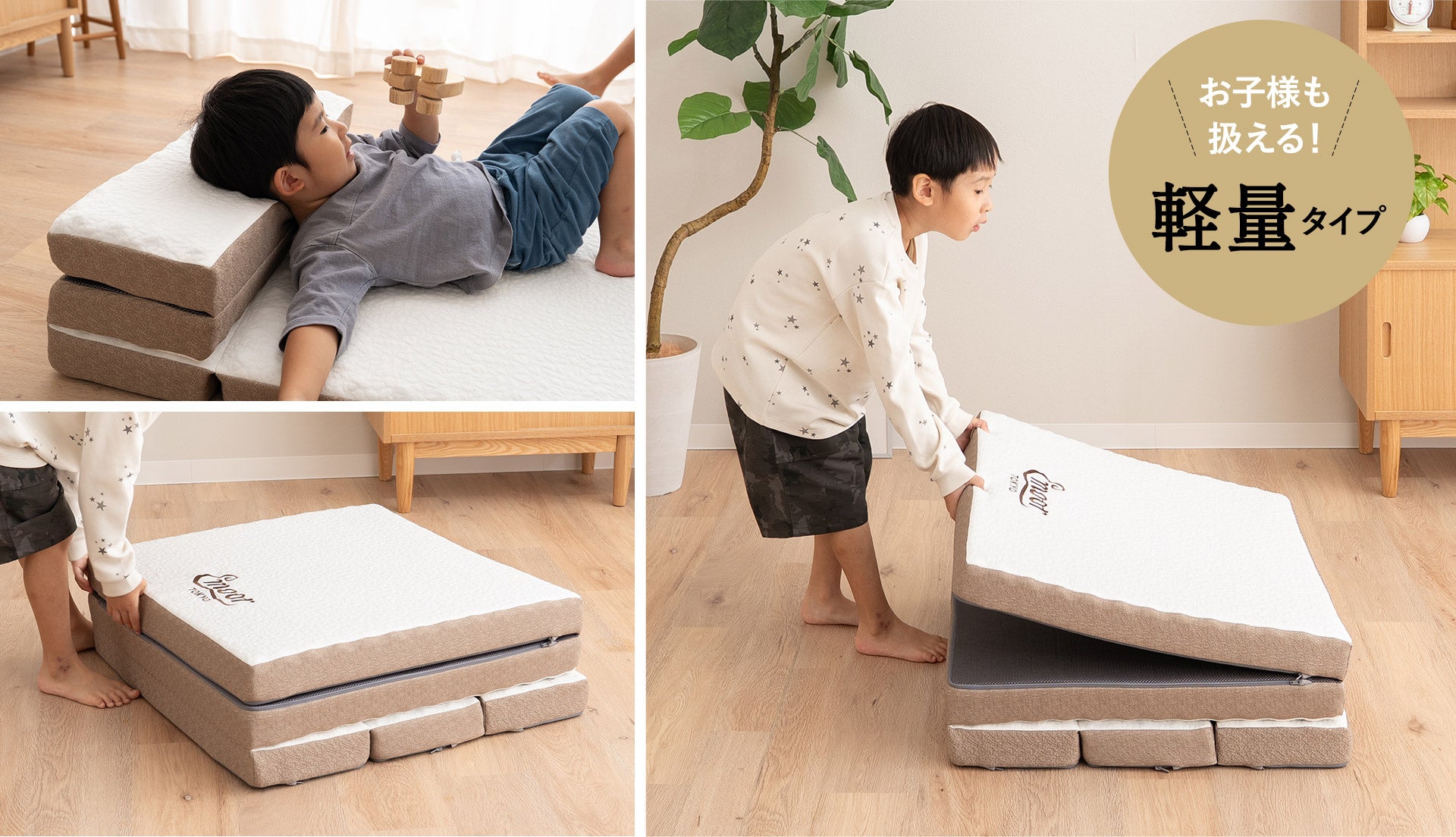 マット本体に紐や取っ手を付けないシンプル仕様。引っかかる心配がなく、小さなお子様がいるご家庭でも安全に使用できます。約3.3kgの軽量設計で敷いたり畳んだりしやすいため、キッズマットレスやプレイマットとしてもお使いいただけます。