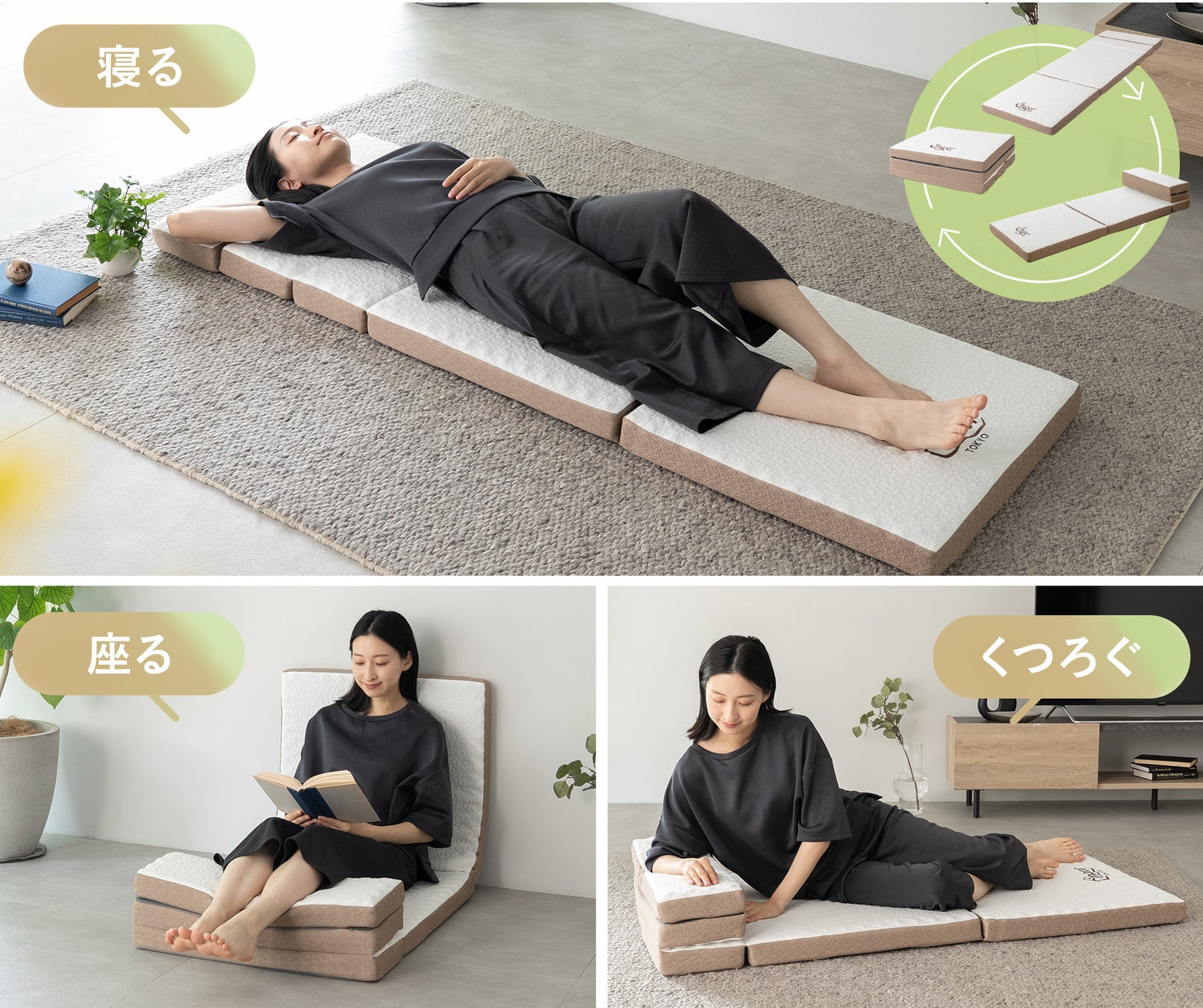 どこでも眠れる安心感♪これ一枚で「寝る・座る・くつろぐ・収納」が実現するミニマル寝具『5つ折りごろ寝マット -NESTLEAP-』が新登場!"寝る"と"たたむ"の専門家が様々な場面での快眠を設計。