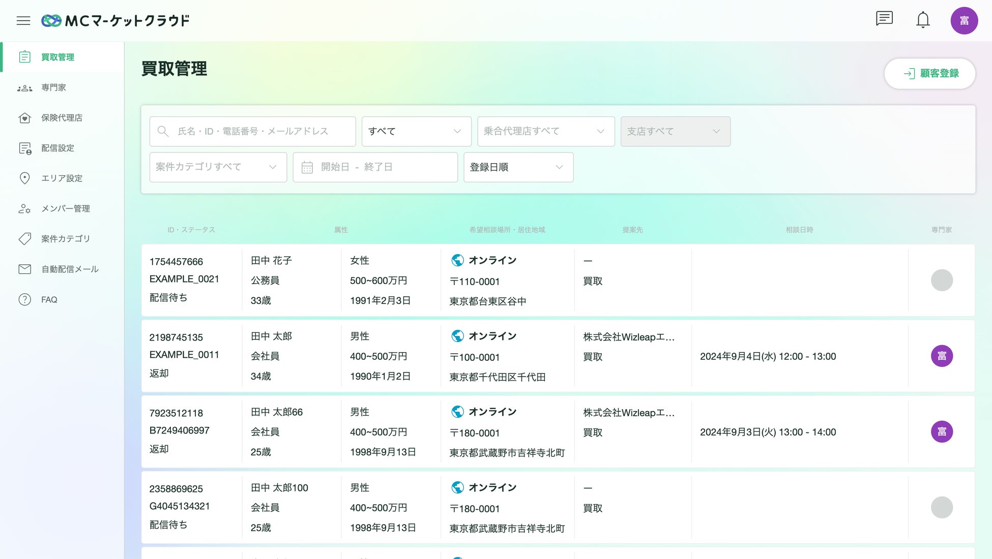 MCマーケットクラウドは、保険共同募集の効率化と成約率改善を実現する、アポ配信企業向けの案件配信システムです。これまで100社以上の保険代理店と共同募集をしてきたマネーキャリアのノウハウをもとにした、圧倒的な使いやすさと独自の専門家スコア機能・分析機能が備わっており、業務効率と成約率の課題を同時に解決します。