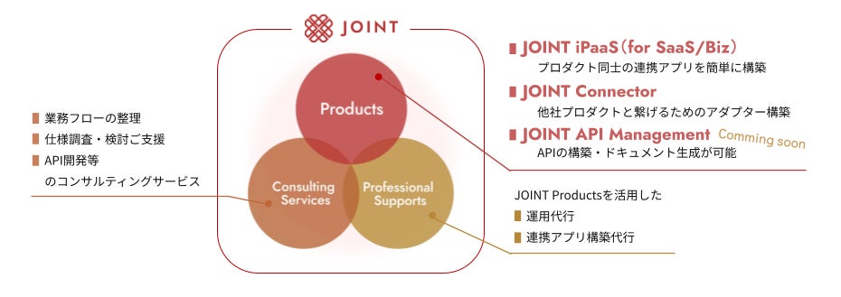 SaaSベンダーやエンドユーザーがSaaS提供・活用する際に “データ連携を意識しなくていい世界” を実現するJOINTシリーズは、「JOINT iPaaS」を含む【Product】【Consulting Service】【Professional Supports】の3つから構成されます。