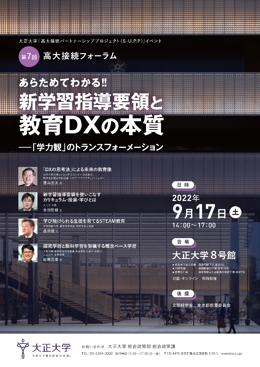 - 『DXの思考法』の著者である西山圭太氏、学習指導要領改訂担当の合田哲雄氏、高校教員として教育改革を牽引する品田健氏、大学教員として高等教育開発を推進する佐藤浩章氏と大正大学副学長 神達知純によるシンポジウムで、現在から未来へ教育を紡ぎます。