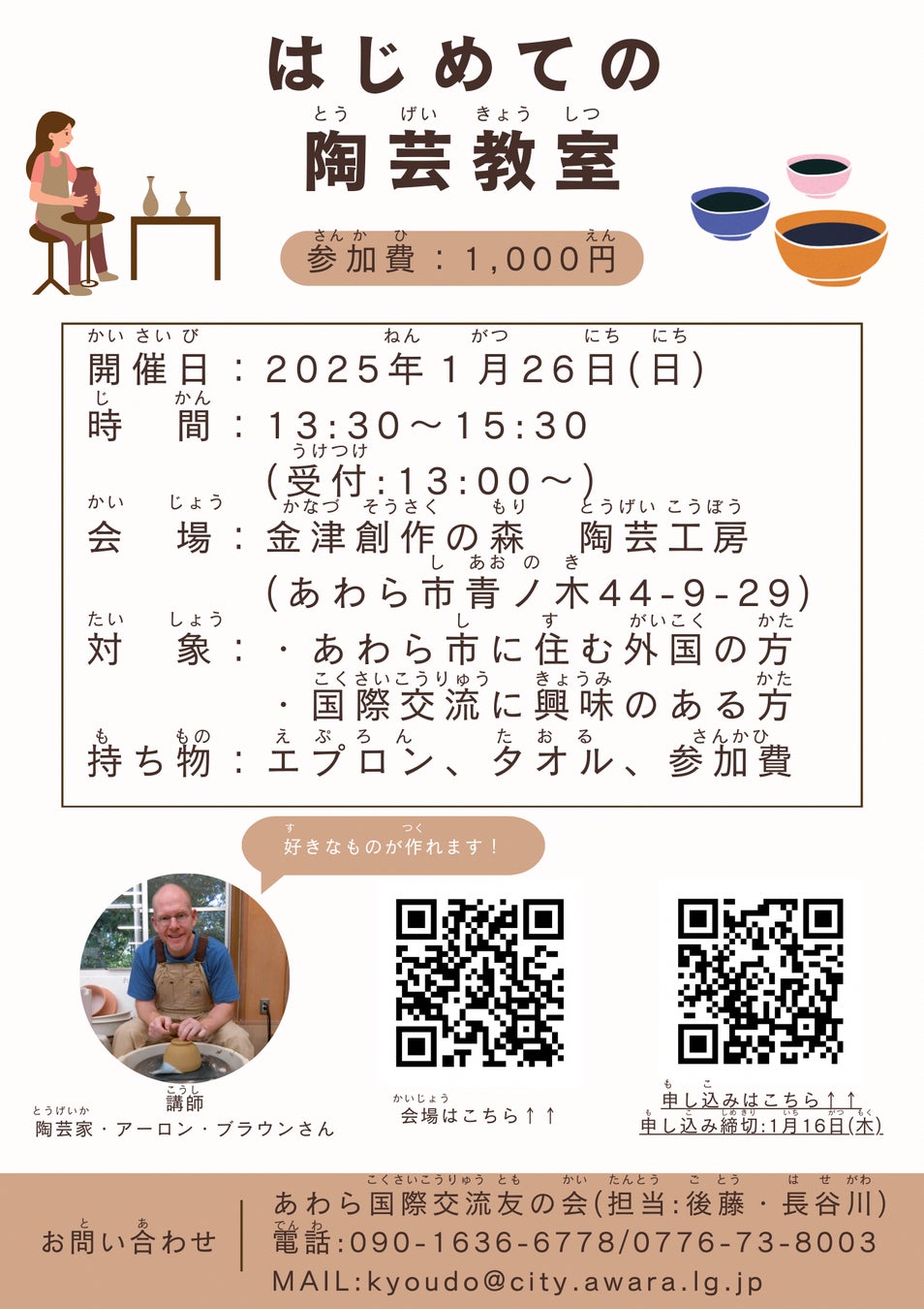 アーロン・ブラウンさんが教える陶芸を通じて国際交流しよう!世界と繋がるあわら市の多文化共生イベントを開催