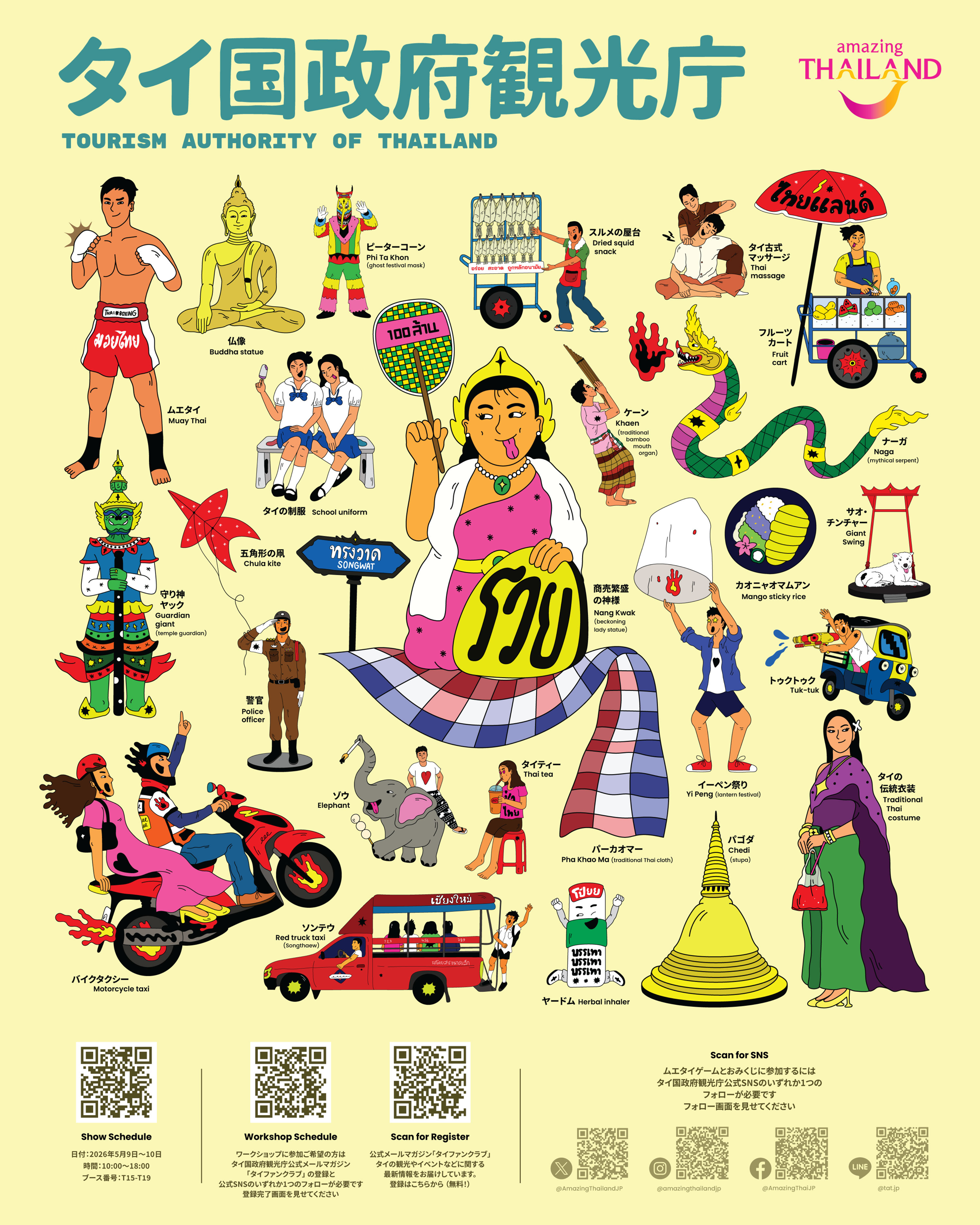タイ国政府観光庁(TAT)のAmazing Thailandブースでは、タイを「グローバルなポップカルチャーの目的地」として位置づけ、多様な角度からタイカルチャーを紹介します。5ブースの体験型コンテンツをご用意し、実際に「遊び、感じ、体験する」ダイナミックなプレイグラウンドとして、タイの新しい魅力をお届けします。