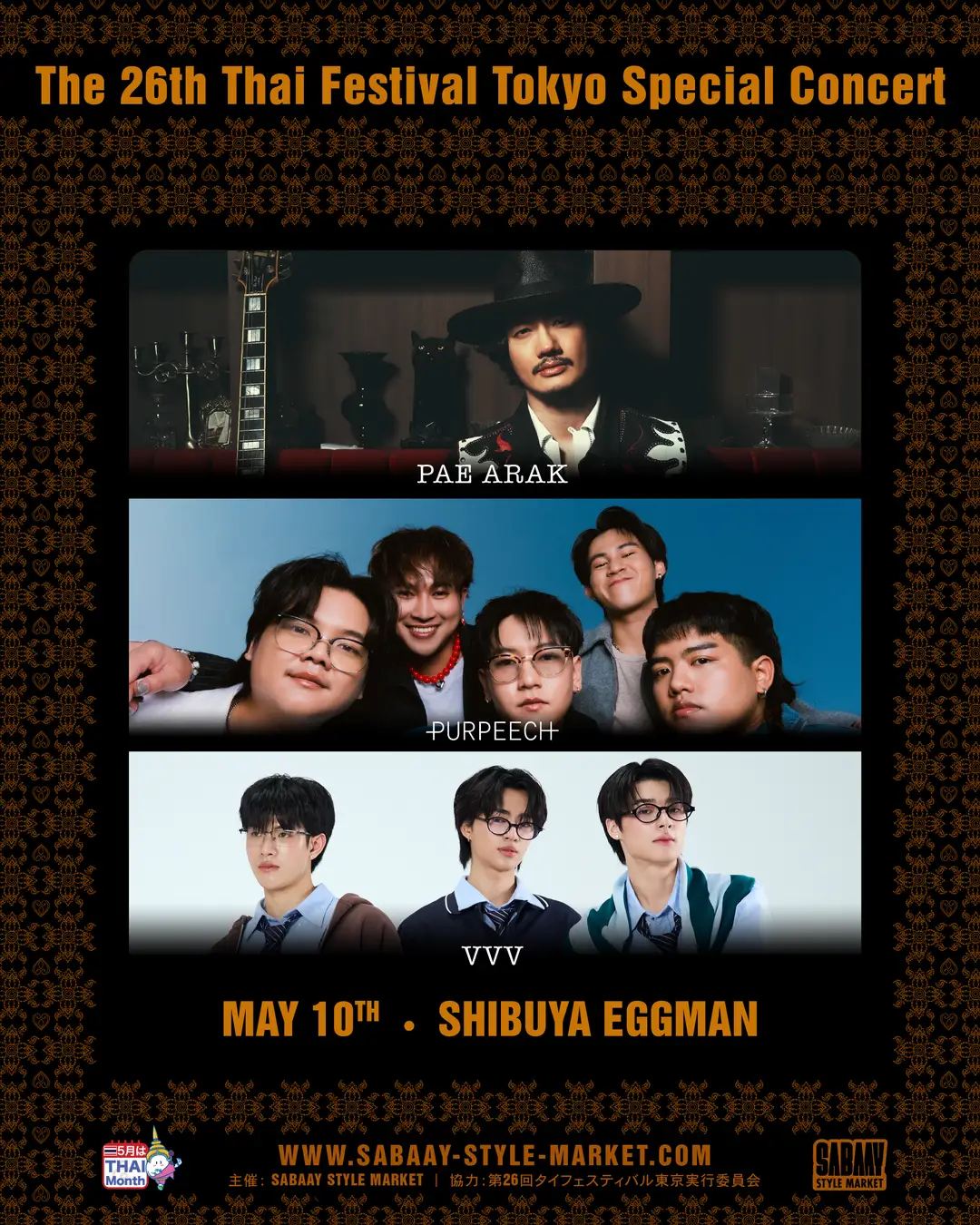 タイの若者から絶大な支持を得るインディーポップバンドPurpeech、俳優としても活躍する実力派アーティストPae Arak、そしてエネルギッシュなパフォーマンスが魅力のVVVが集結。今のバンコクの空気感をそのまま代々木から渋谷へお届けします。