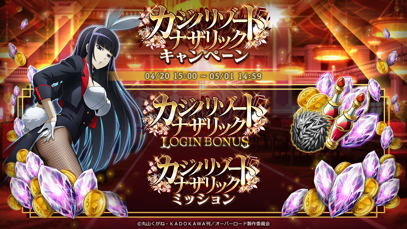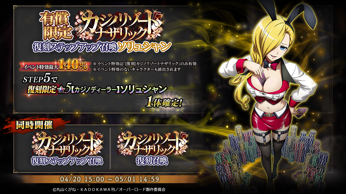 4/20より『カジノリゾートナザリックキャンペーン』』を開催!イベント『[復刻]カジノリゾートナザリック』を開催いたします!イベント連動召喚『有償限定カジノリゾートナザリック復刻ステップアップ召喚』では★5【カジノディーラー】ソリュシャン、★5【カジノバニー】ナーベラルが再登場!