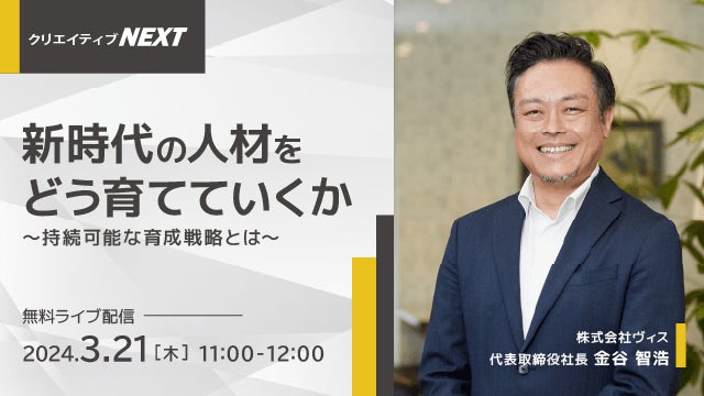 ワークデザインを手がける株式会社ヴィス(本社:大阪市北区、代表取締役社長:金谷智浩、以下ヴィス)は、2024年3月21日、株式会社フェローズ(本社:東京都渋谷区、代表取締役社長 野儀健太郎、以下フェローズ)が主催する「クリエイティブNEXT」にて、オンラインセミナー「新時代の人材をどう育てていくか~持続可能な育成戦略とは~」に登壇することをお知らせします。詳細・申込:https://job.fellow-s.co.jp/creative-next