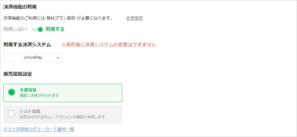 なお、選択できる決済システムは「Stripe」と「UnivaPay」の2つです。