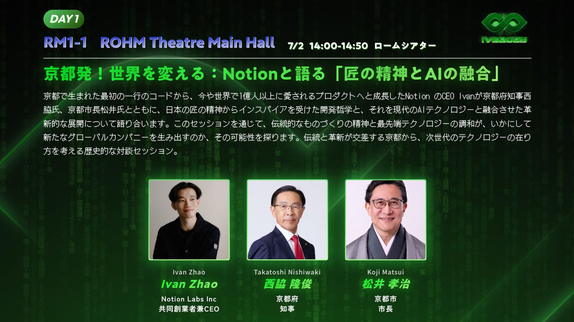 Day1(7月2日)14:00より、IVS2025 Welcomeセッションをロームシアター メインホールにて開催します。京都で生まれた最初の一行のコードから、今や世界で1億人以上に愛されるプロダクトへと成長したNotion Labs Inc. 共同創業者兼 CEO アイバン・ザオ (Ivan Zhao)氏が、京都府知事 西脇隆俊氏、京都市長 松井孝治氏とともに登壇。