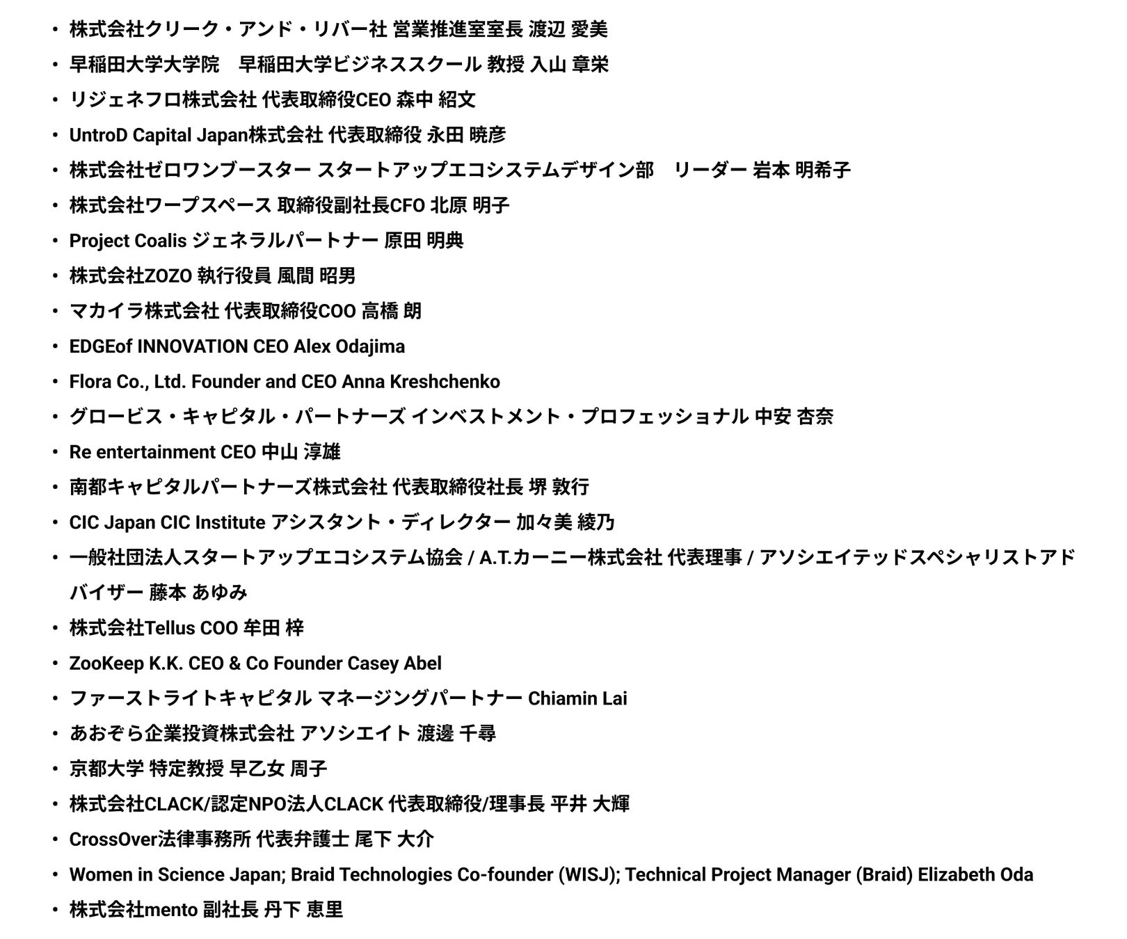 スタートアップの起業家からは、慶應義塾大学在学中にdelyを設立し、「クラシル」を日本最大のレシピ動画サービスに成長させた堀江裕介氏、AI・リーガルテック分野で起業した安野たかひろ氏、ミレニアル女性向けキャリア支援「SHElikes」で20万名以上の受講者を獲得したSHE株式会社の福田恵里氏、そして、女性の体とメンタルケアを目的としたFloraを創業したAnna Kreshchenko氏など、多様なバックグラウンドを持つ起業家が参加します。