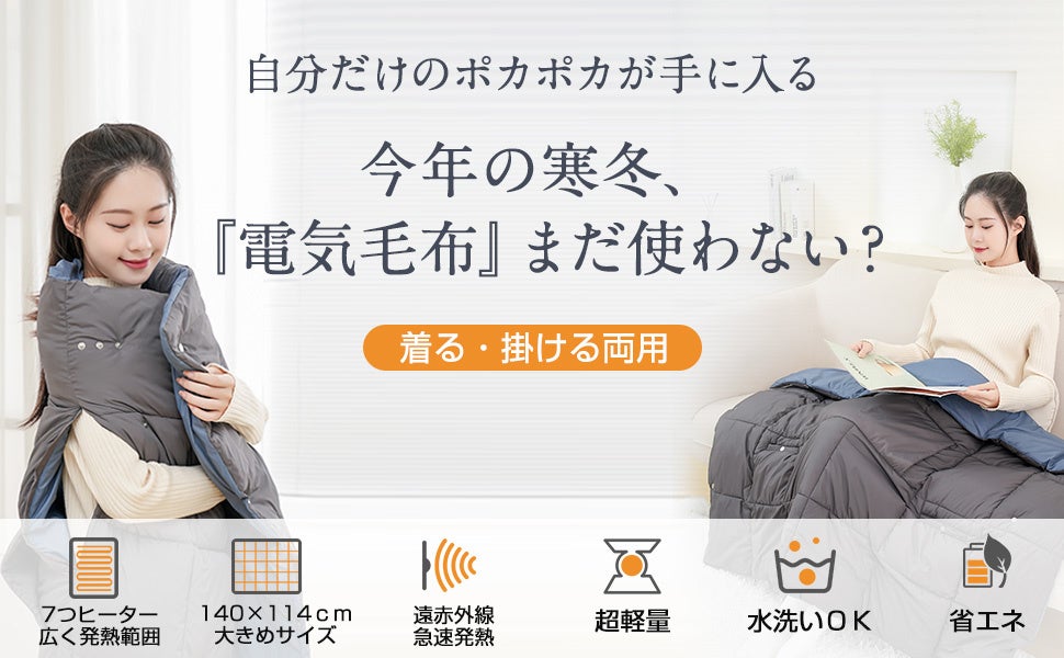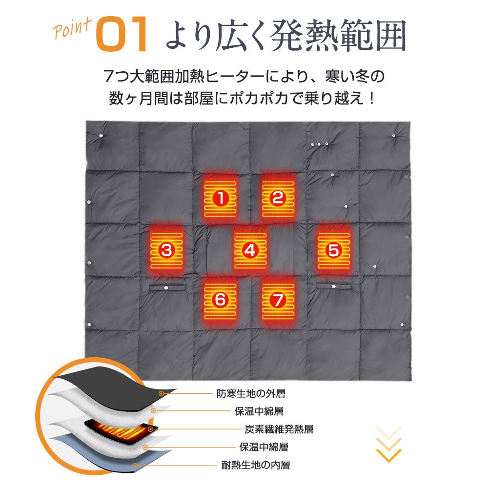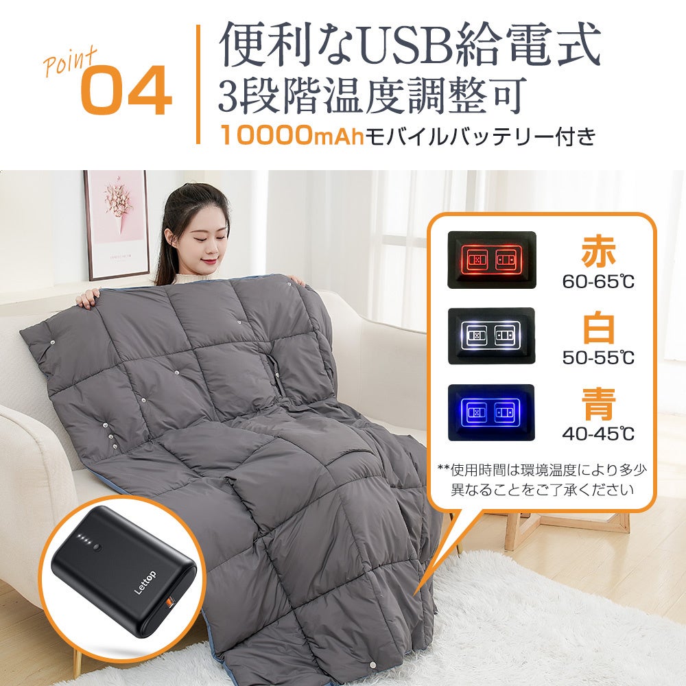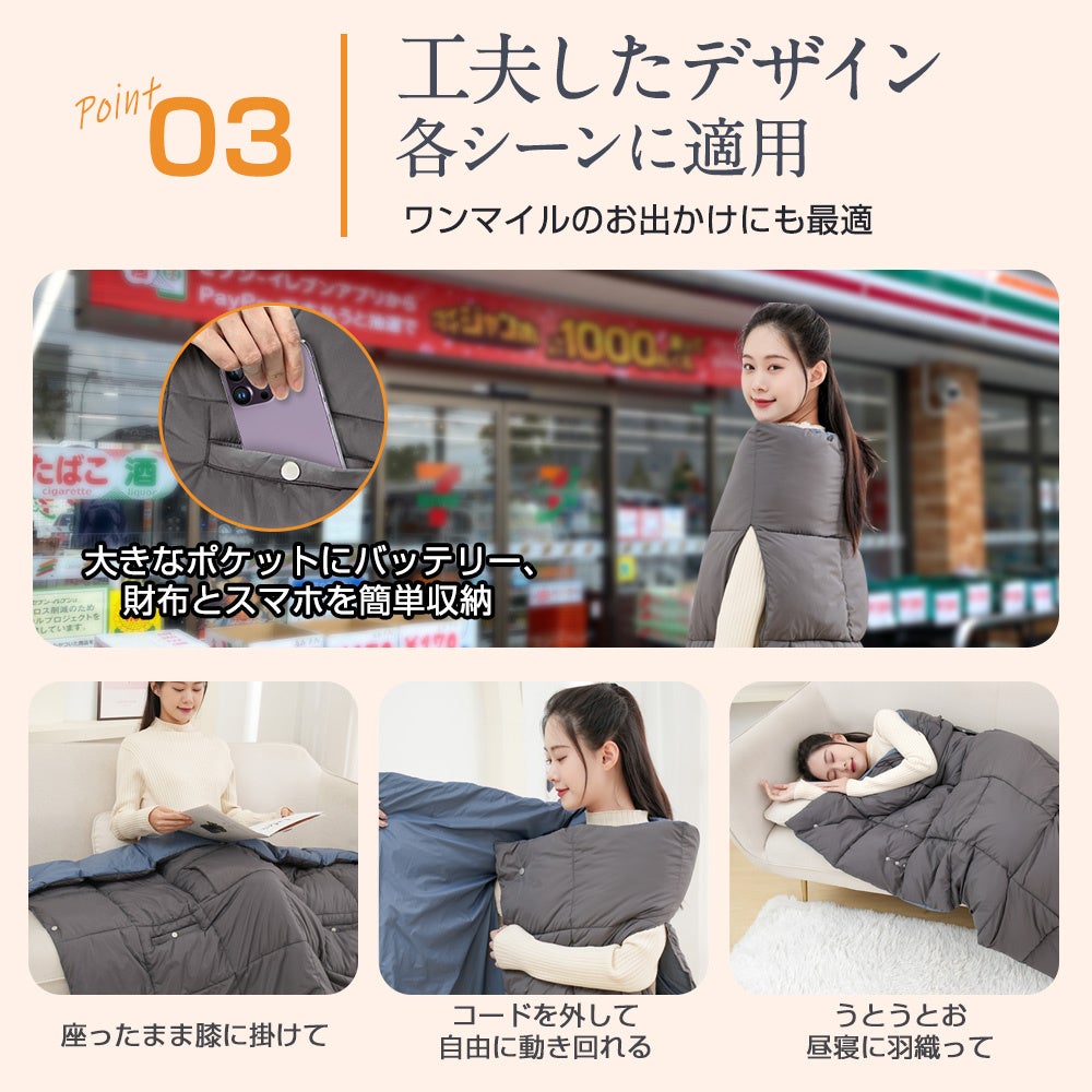 すっぽりと足先まで包み込む大判サイズ(140cmx114cm)、しっかりとカラダを覆うほどの大きさ。露出部分を少なくし、さらに冷えからあなたを守り、暖かさをプラスできます。合わせて7つヒーターで、加熱範囲を拡大し、より早めに温めます。1つのボタンを押すだけで、温度が3段階に切替え、お好みの温度に合わせられ、秋冬に最適です。また、両側に大きなポケットが付き、モバイルバッテリーやスマホなどはすっきりと入れます。