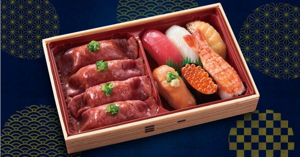 「上うなぎ」と「特撰牛肉にぎり」が一度に味わえる欲張りなメニューです。日々頑張るお父さんに、スタミナを♪