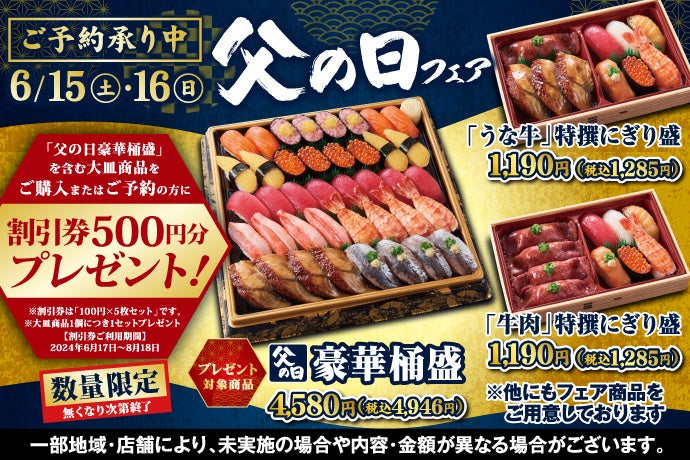 嬉しい特典として、「父の日豪華桶盛」を含む大皿商品をご予約、ご購入のお客様に、大皿商品1個につき、父の日フェア後に利用できる『割引券 500円分』を進呈!