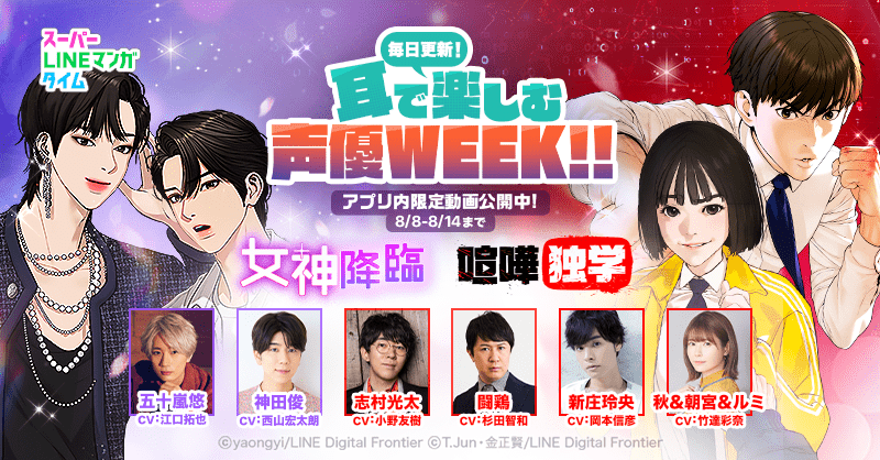 LINE Digital Frontier株式会社 (本社:東京都新宿区、代表取締役:金信培(キム・シンベ)/髙橋将峰) は、当社が運営する電子コミックサービス「LINEマンガ」https://manga.line.me/ で開催中のキャンペーン「スーパー LINEマンガ タイム」の特別企画として、本日8月8日(月)より「耳で楽しむ声優WEEK」を実施します。