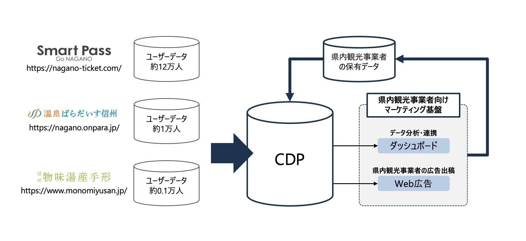 長野県観光機構が保有する各種データ(例:長野県公式観光サイト「Go NAGANO」のアクセスデータやメルマガ会員データ、「温泉ぱらだいす信州」や「物味湯産手形」などの購買データ)の統合