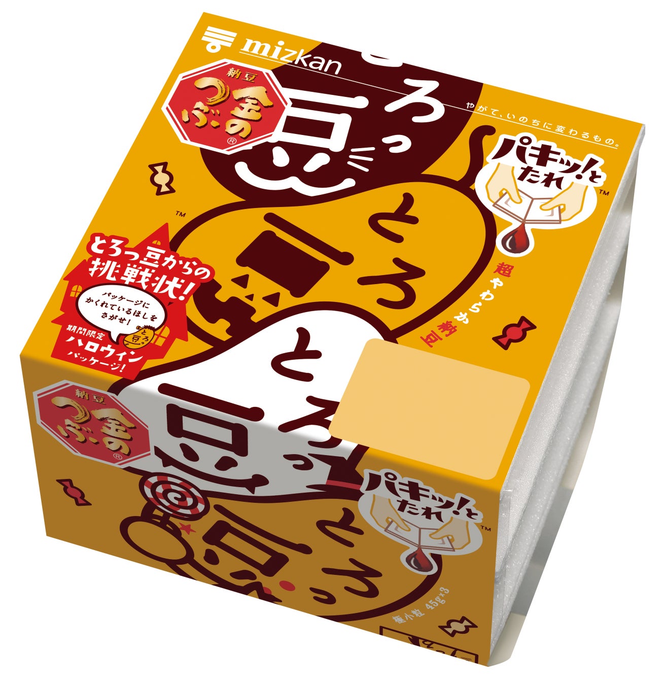 そのような高い人気を誇ったパッケージが、さらに楽しいデザインとなって新登場いたします。新デザインに加え、『とろっ豆からの挑戦状』というオリジナルミニゲームが付いています。この『とろっ豆からの挑戦状』は、パッケージに隠れているおばけやカボチャ等ハロウィンにちなんだものを探したり、数を数えたりするミニゲームで、難易度は易しいものから難しいものまで複数ご用意しております。ぜひご家族のみなさまでミニゲームを楽しんでみてはいかがでしょうか。
