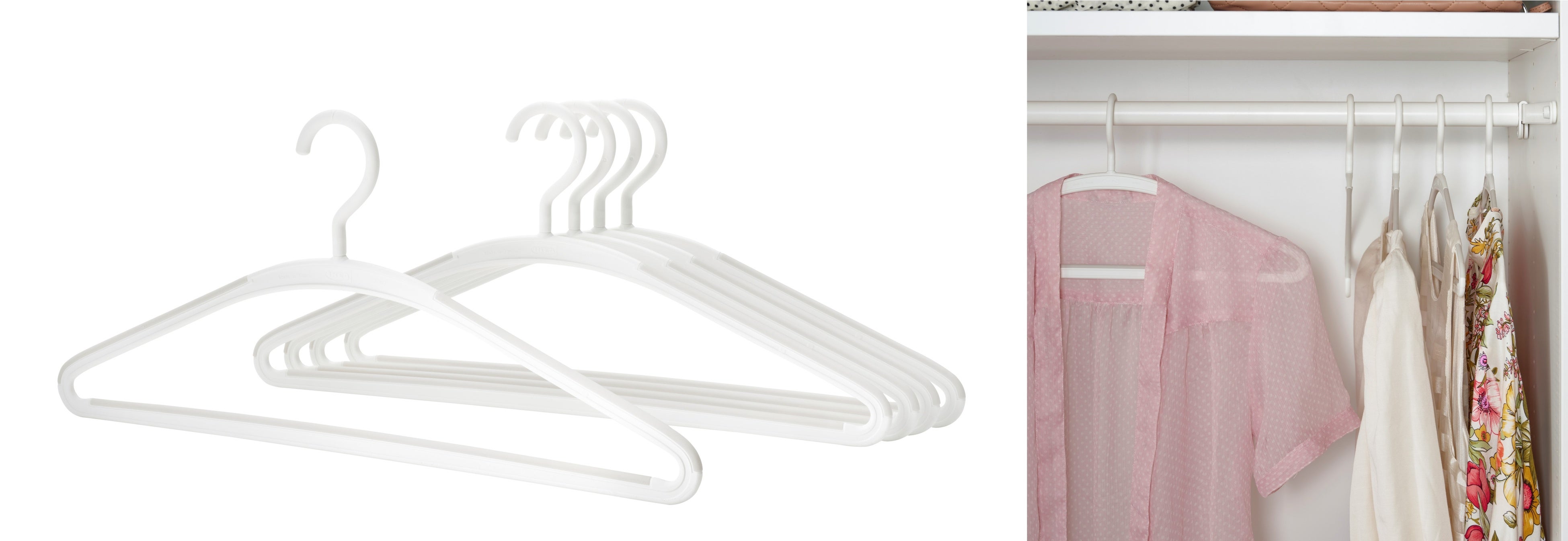 ヘッド部分が回転する使い勝手のよい軽量のハンガー。滑り止め付きなので、ニットのセーターやシルクのように滑らかなブラウスなど、薄くてデリケートな生地の服が滑り落ちません。プラスチック製なので、使用する場所を選びません。