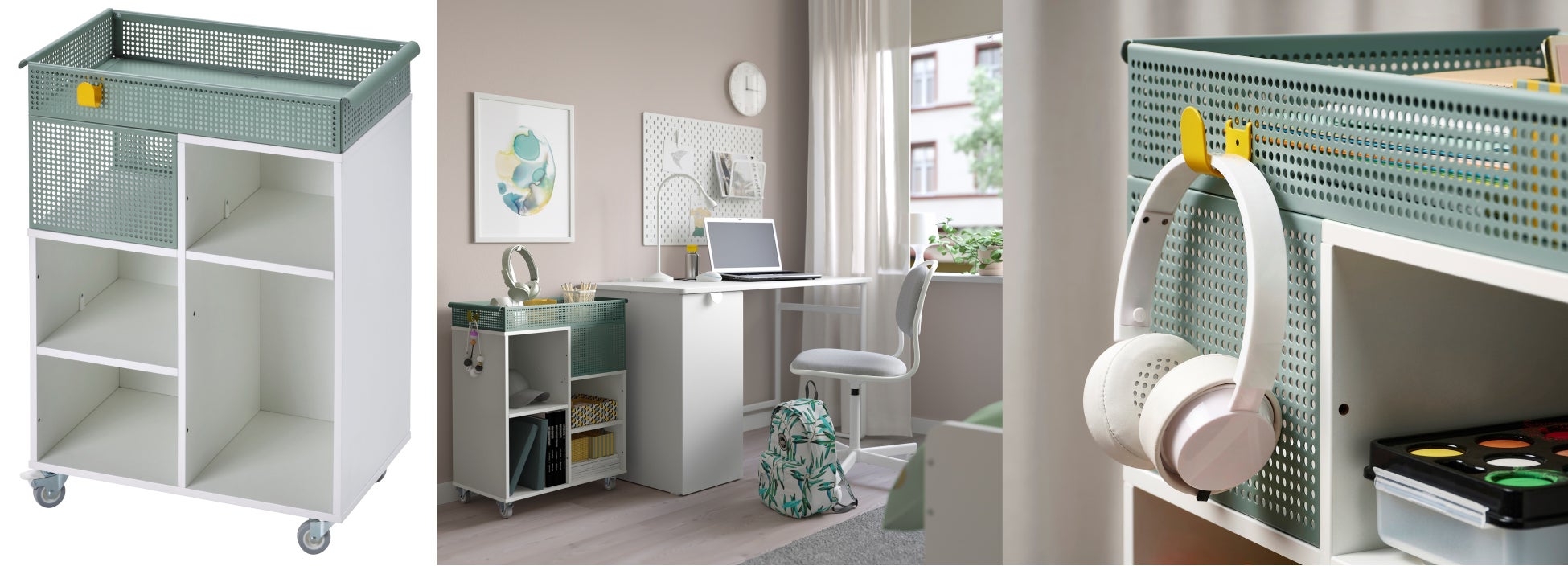 トップの丸みのある縁を引いたり、押したりして、簡単に色々な場所へ移動できます。鉛筆や本など、お子さまが宿題をするのに必要なあらゆるアイテムを整理できるスペースがたっぷりあり、フックをつるす場所はお子さま自身で決めることができるので、楽しく学ぶことを促すことができます。お子さまが新しいことに取り組んだり、やる気を維持したり、あらゆる場所をワークスペースに変えたりするのに役立ちます。