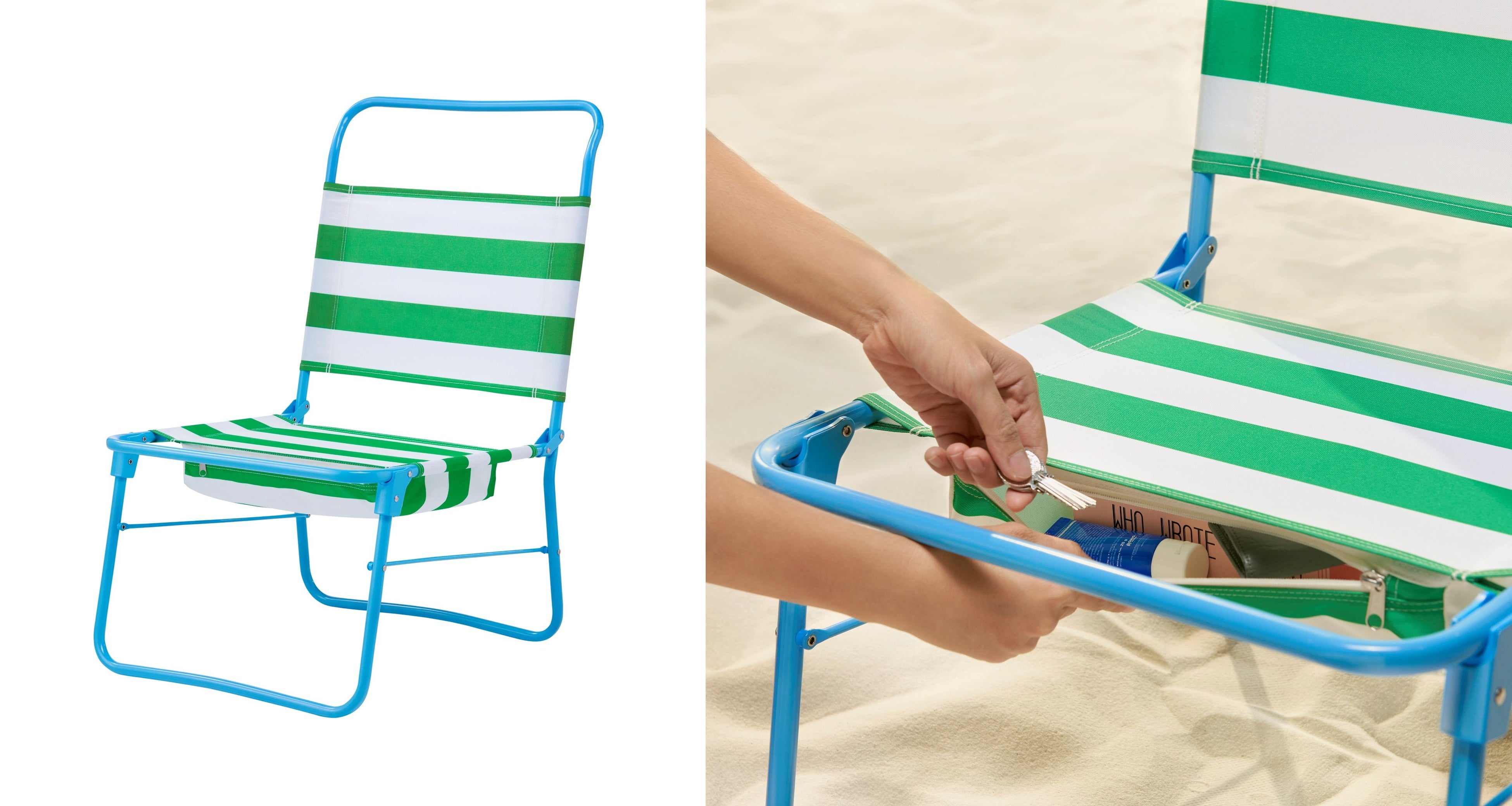 ステキな夏の雰囲気を演出する色と模様のビーチチェア。チェアのシートの下にファスナー付きのポケットがあるので、貴重品を収納できます。幅の広い快適なシートでありながら全体的にコンパクトなサイズなので、両側のストラップで簡単に持ち運べます。使わないときはたたんで収納できます。