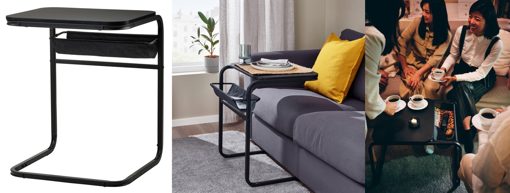 この多機能なテーブルは、1台で2通りの使い方が楽しめます。やや高めのサイドテーブルから低めのコーヒーテーブルにすばやく形を変えられるので、ソファまわりでさまざまなアクティビティを楽しむのに便利です。例えば、 ソファの前にさっと移動させれば、テレビを観ながら食事したり、友だちが訪ねてきたら、すばやくスタイリッシュなコーヒーテーブルに変えたりできます。テーブルトップの下の布製ポケットは、手近に置いておきたい小物をスマートに収納スペースもあります。