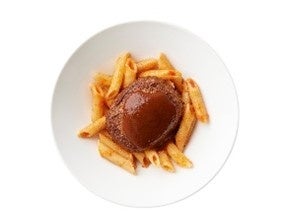 チーズがたっぷり入ったハンバーグに、ペンネ、デミグラスソース、どれも植物由来の材料で作りました。このボリュームでワンコインなだけでなく、サステナブルな商品です。