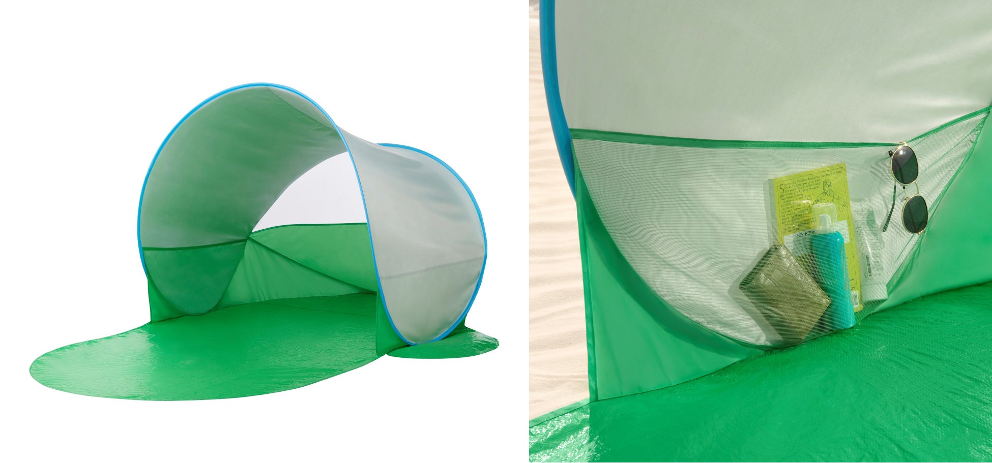 夏の晴れ渡った青空を思わせるステキな色のポップアップテントです。軽量なので、あっという間にビーチテントを立てたり、たたんで付属のバッグにしまったりできます。持ち運びも便利。テントの内側にあるモノをしまえる便利なポケットが2個付いています。