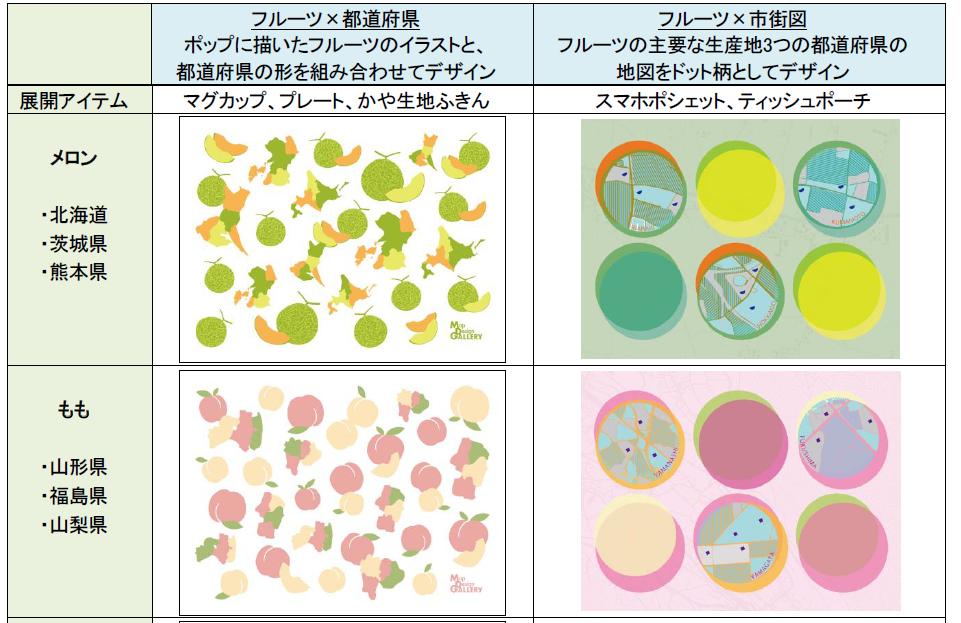 本商品は、フルーツとそれぞれの主要な生産地の地図をポップなデザインで表現しています。今回モチーフとしたフルーツと生産地は、メロン(北海道、茨城県、熊本県)、もも(山形県、福島県、山梨県)、いちご(栃木県、愛知県、福岡県)、ブルーベリー(群馬県、東京都、長野県)、オレンジ(広島県、和歌山県、愛媛県)です。