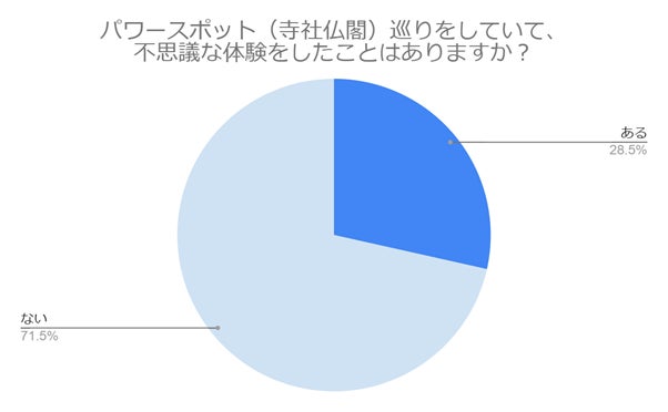 「パワースポット(寺社仏閣)巡りをしていて、不思議な体験をしたことはありますか?」とお聞きしたところ、「ある」と答えた方が28.5%、「ない」と答えた方が71.5%でした。
