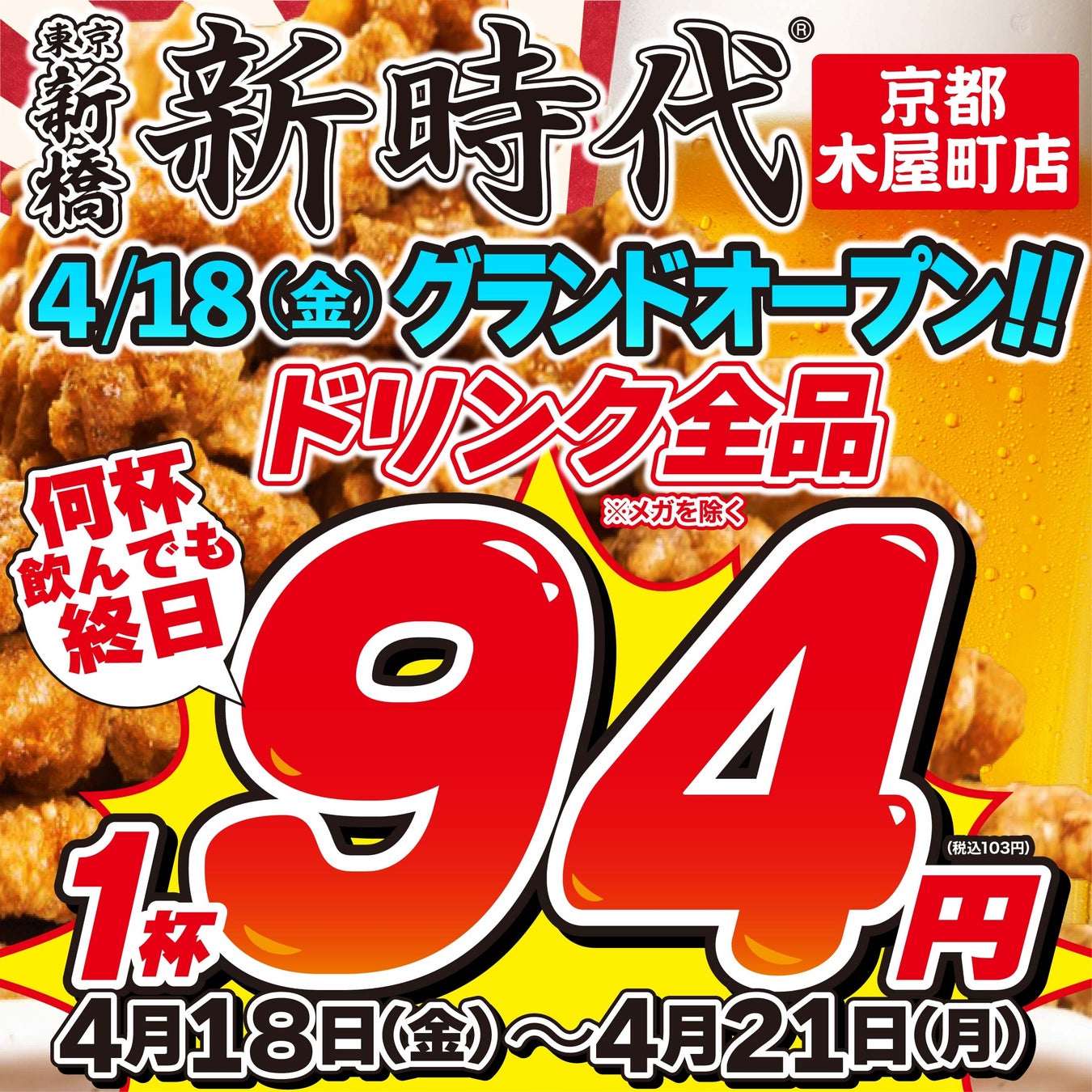 新時代 京都木屋町店オープンを祝しまして、4月18日(金)~4月21日(月)はメガ以外のドリンク全品、何杯飲んでも終日1杯94円(税込103円)のオープン記念イベントを開催いたします!