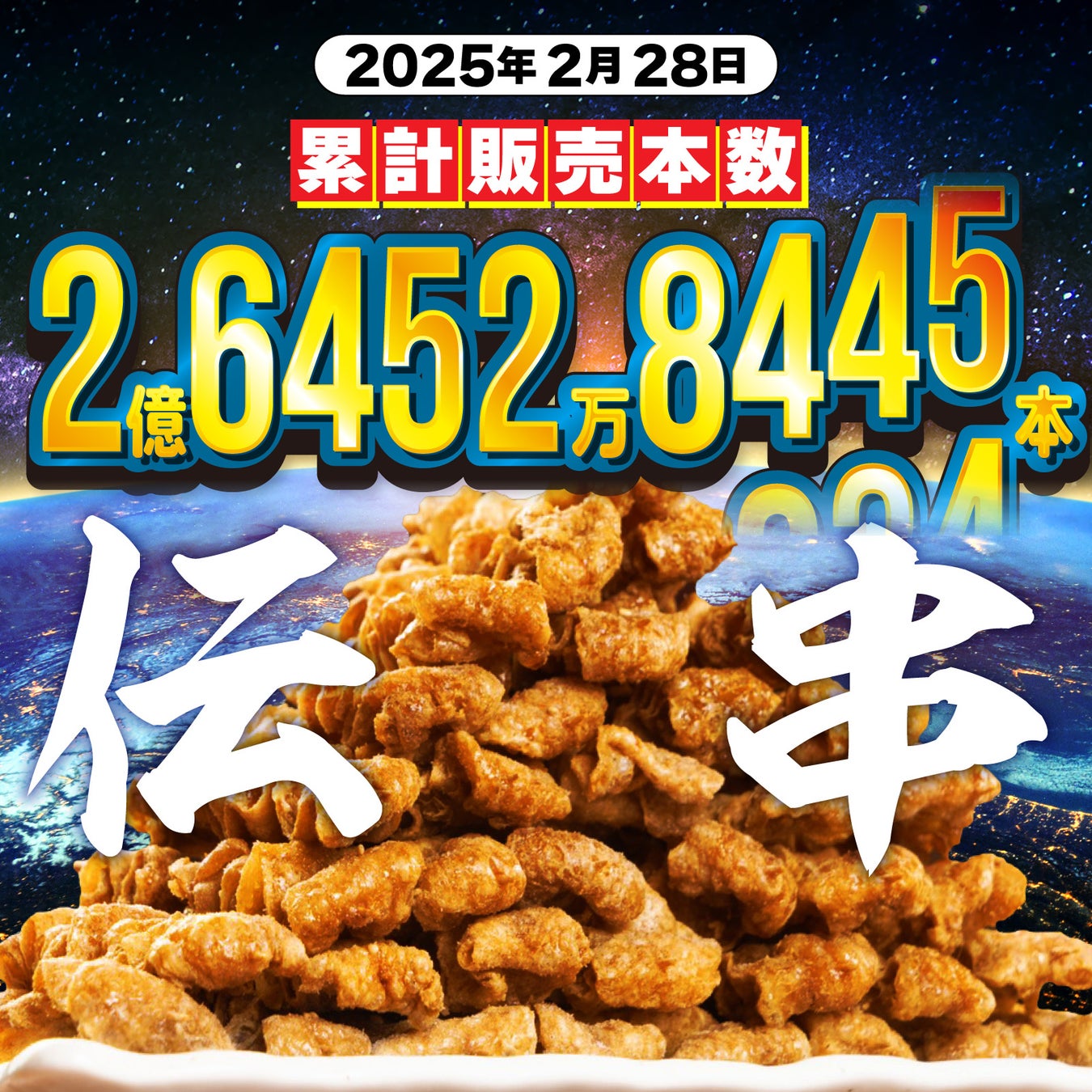 全国に約170店舗を展開する話題の居酒屋『新時代』で、圧倒的な支持を集める名物メニューが「伝串」です。累計販売数はなんと2.6億本を突破。ご来店いただいたお客様のほとんどが注文し、平均でお一人5本以上お召し上がりいただくほど、圧倒的なリピート率を誇る人気商品です。