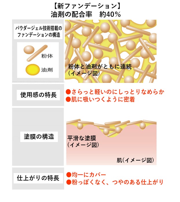 パウダーファンデーションの軽さとリキッドファンデーションの密着性を両立した新感覚※1のパウダーファンデーションです。花王独自のパウダージェル技術※2により、従来の4倍以上※3のオイルを配合。パウダーファンデーションのように軽やかでありながら、リキッドファンデーションのようななめらかな密着感で、肌の状態を選ばず均一にカバー。骨格を美しく引き立て、立体感のある肌へ仕上げます。