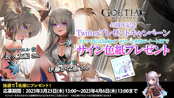 株式会社アピリッツ(本社:東京都渋谷区、代表取締役社長執行役員CEO:和田 順児)が開発・運営するスマートフォンアプリ・ブラウザゲーム・PlayStation®4/PlayStation®5版『ゴエティアクロス』は、2023年3月27日(月)でサービス開始4.5周年を迎えました。