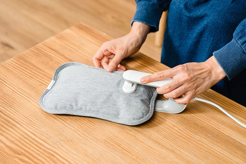 従来の湯たんぽのようにお湯を入れ替える必要はなく、本体を電気で発熱・蓄熱させる仕組み。