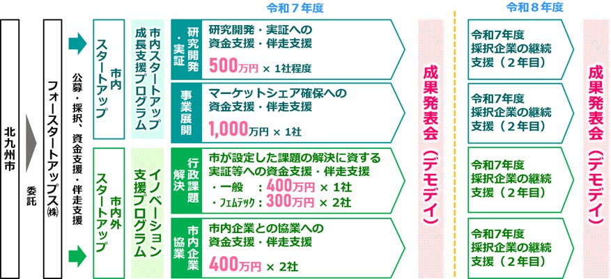「市内スタートアップ成長支援プログラム」と、スタートアップによる行政課題の解決や、市内企業との協業に対し、資金支援・伴奏支援を行う「イノベーション支援プログラム」で構成されています。