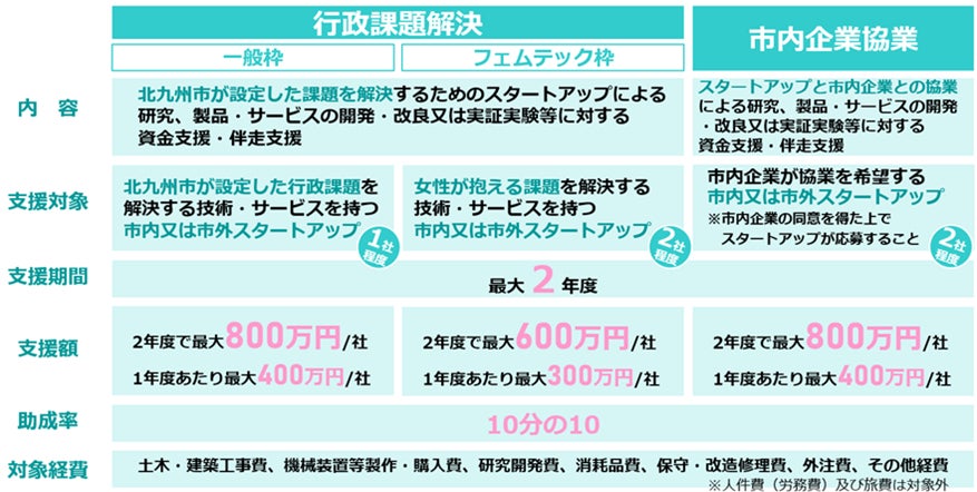 北九州市では、「企業変革・スタートアップ・グロースサポート事業」により、市内スタートアップに特化した成長支援や、スタートアップによる行政課題の解決、市内企業との協業に対する支援を行っています。