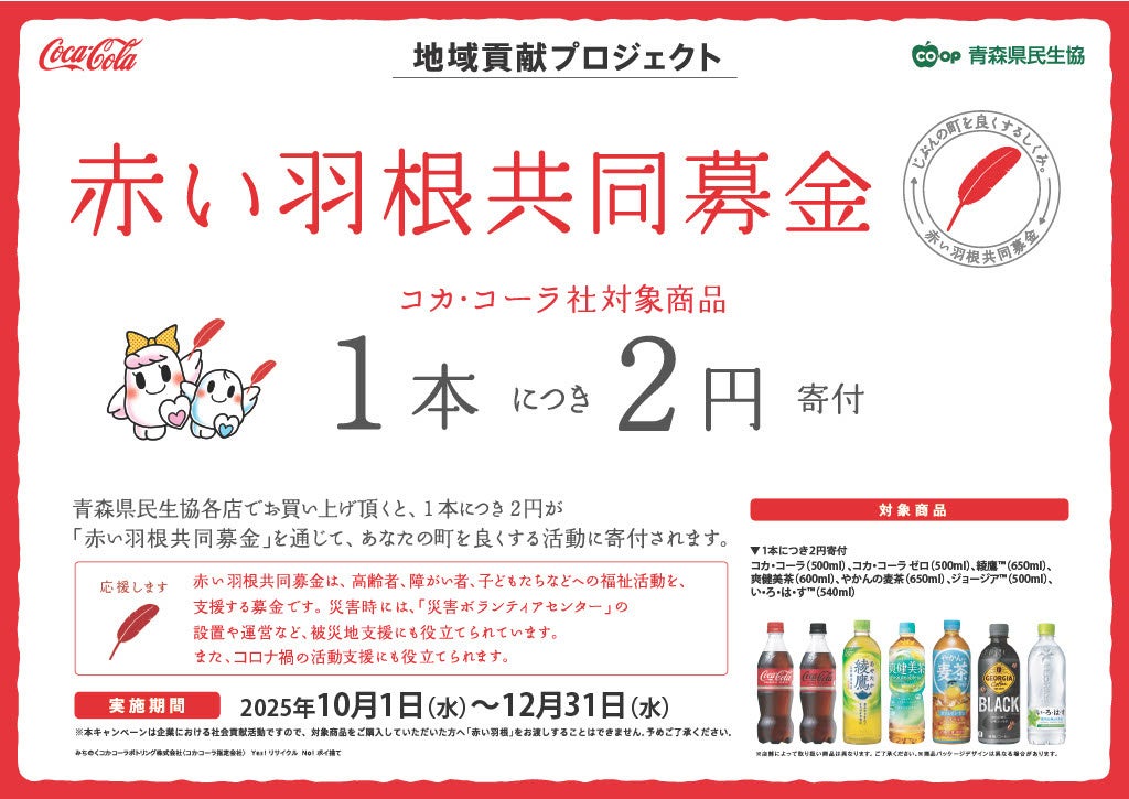 このプロジェクトは、青森県内の地域福祉推進に役立てることを目的に、2025年10月1日(水)~ 12月31日(水)の3ヵ月間、青森県民生協全12店舗において「コカ・コーラ社対象商品」を購入いただくと1本につき2円が赤い羽根共同募金に寄付されるもので、期間中に売り上げた本数は147,085本、寄付金額は294,170円となりました。なお、このプロジェクトは2018年から実施しており、今回を含めた寄付金の合計は1,174,620円となりました。